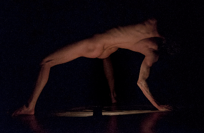 Een bloot lichaam onderworpen aan een spel met licht manifesteert zich, zwevend in een duistere ruimte.